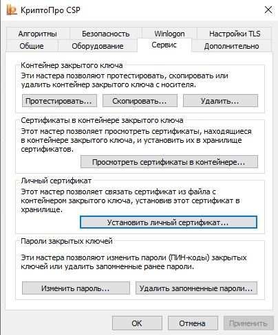 Запустите КриптоПро CSP и перейдите на вкладку «Сервис». Нажмите кнопку «Установить личный сертификат».