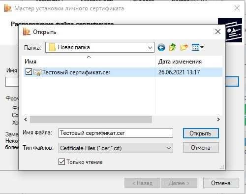 Нажмите обзор и выберите скачанный файл сертификата.