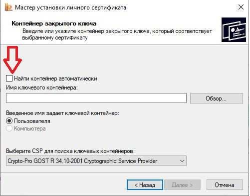 Поставьте отметку «Найти контейнер автоматически» и нажмите «Далее». Не забудьте подключить носитель, на который вы сохранили ключи.