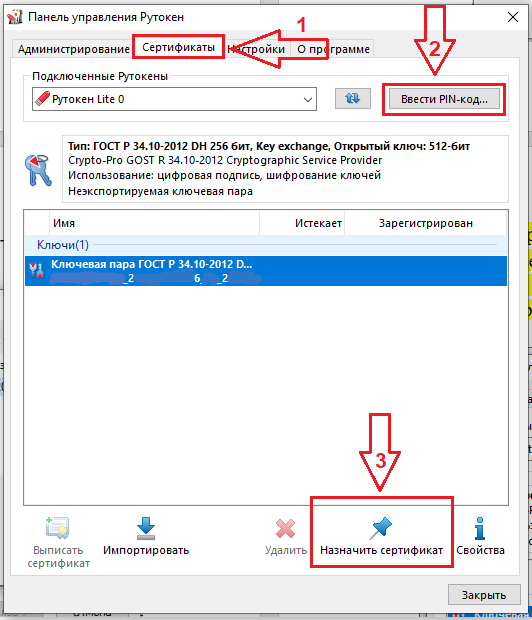 Откройте программу «Панель управления Рутокен». Зайдите в раздел «Сертификаты», введите ваш ПИН-код (Стандартный ПИН-код пользователя Рутокен 12345678), затем нажмите на ключевую пару и нажмите кнопку «назначить сертификат». В появившемся окне найдите ваш скачанный сертификат и выберете его.